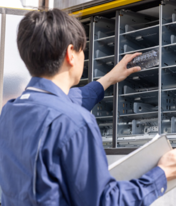 出荷前の自動販売機の値段、配置設定を行い、稼働できる状態に整え市場へもどします。
